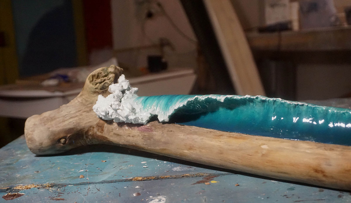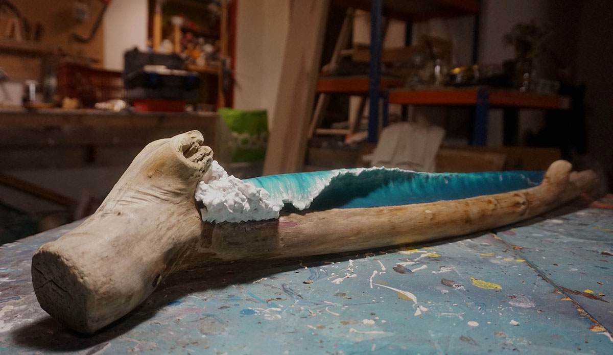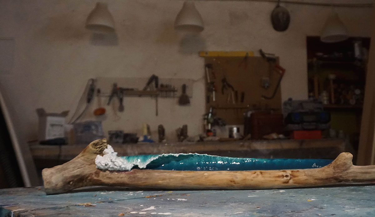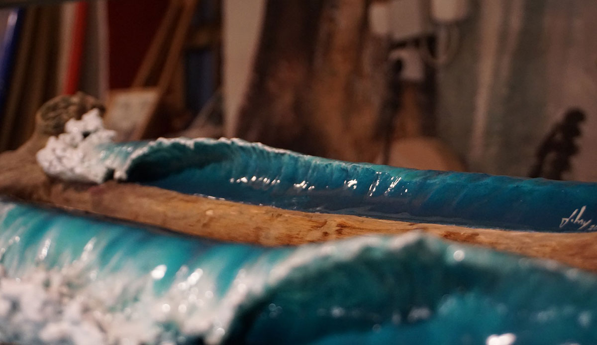 The sculptures, in particular, are eye-catching, and his process is interesting. A mix of wood and gypsum, each one is one-of-a-kind and completely unique. “Even if I tried, it would be impossible to recreate the same piece twice. A wave starts with a dream and a base,” he explained. I use either driftwood or a frame. While driftwood is given by the ocean, the weathered-looking frames are tailor-made. The actual creation then begins with defining the shape of the wave, which is always a spontaneous process built on instant visions and desires.”