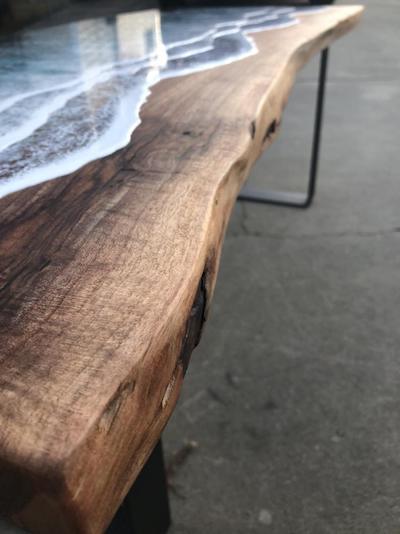 According to Davis’ description of the table on Etsy, the piece is made from reclaimed walnut, and the aerial ocean scene is done entirely out of resin.