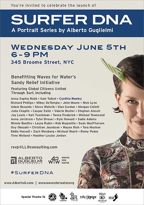 On June 5th, photographer and lifelong surfer Alberto Guglielmi will debut his unique portrait series, “Surfer DNA” at an exhibit in New York City. The exhibit will raise awareness of, and capital for, the ongoing needs of those most affected by Hurricane Sandy. By blending prop styling with technology, each image depicts the accomplished subjects’ tie to the ocean via surfboard fins emerging from their body. Alberto describes the project as, “a visual allegory for the change that occurs when someone becomes a surfer: it doesn’t just affect your life; it becomes part of your DNA. Whether in or out of the water, a surfer’s tie to the ocean is always present.”