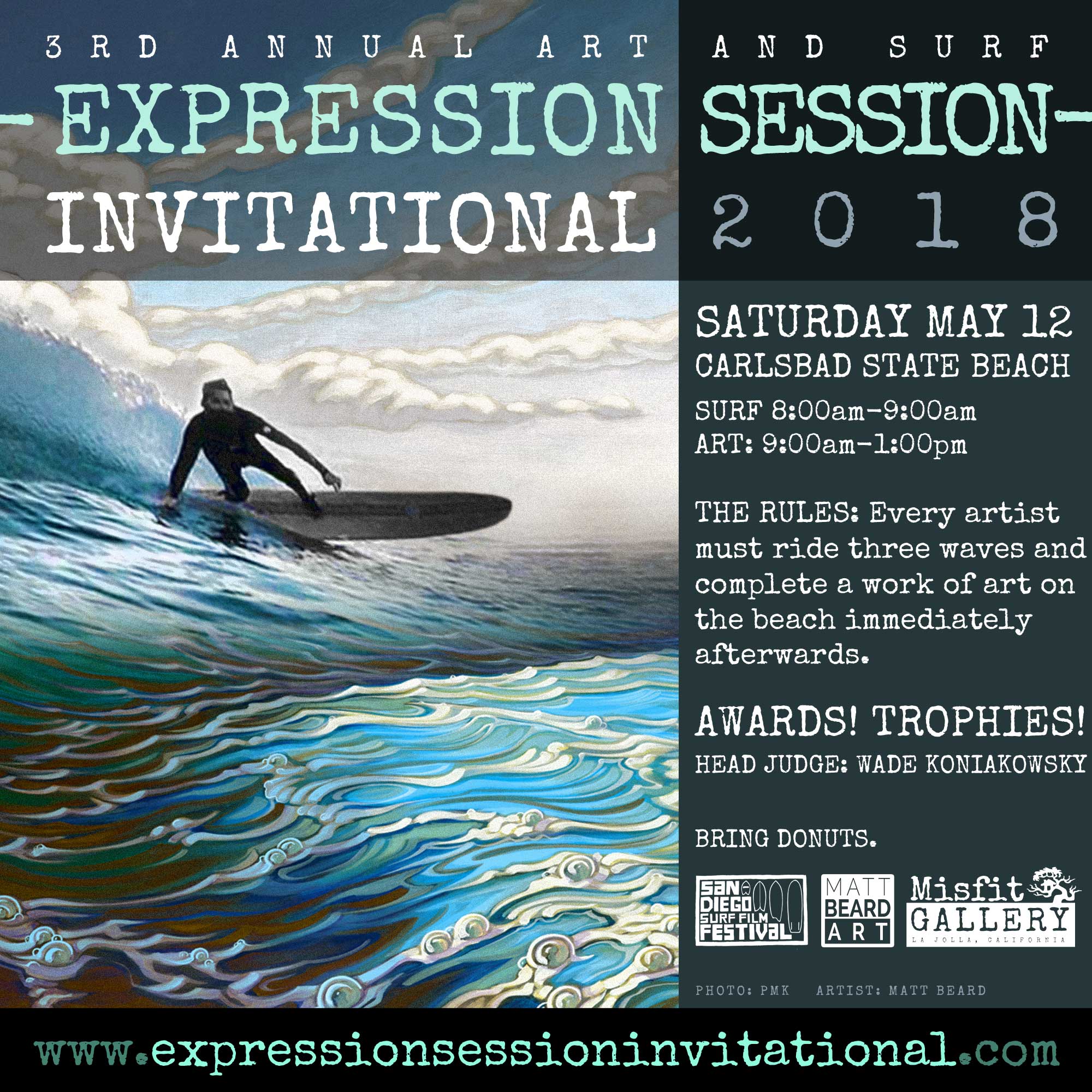 This will be the third year that I’ve been organizing these semi-competitive events, in conjunction with the San Diego Surf Film Festival. Art shows featuring surf-themed art have become commonplace all over the world, but they are often held indoors and sometimes nowhere near the ocean. In settings like these, the words “surf” and “art” are presented as these unmovable concrete nouns, instead of the verbs that they really are. The artists and public alike stand around at these events wearing things like…shoes. So the Expression Session Invitational was created to remedy that artistic gap.