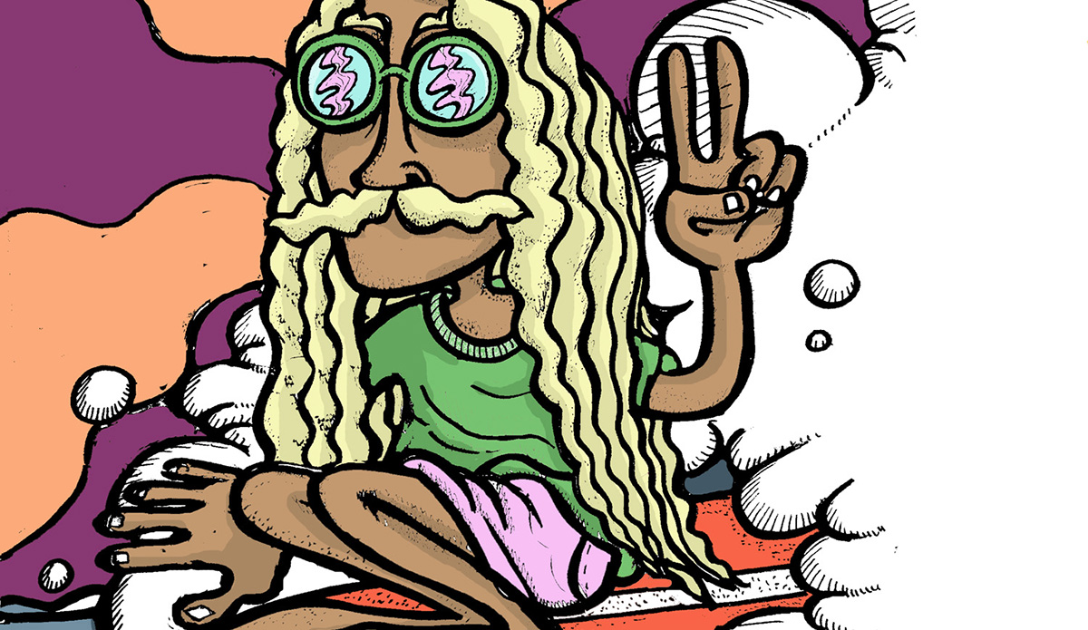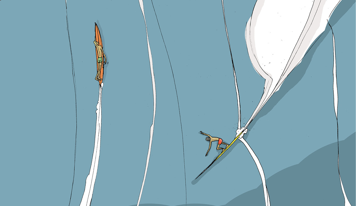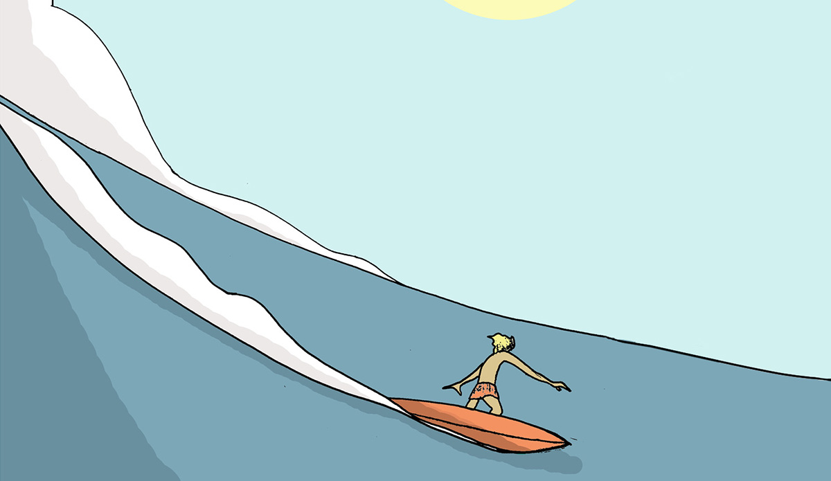 Mark Iomal is a gifted Italian surf artist. His drawings are metaphysical representations of the underground surfing world and culture. From a sheet of paper, he pulls out snapshots that go deeper than the physical reality and are instead placed in an indefinite place and time. They’re fragments of his memories from all over the world — places like Fiji, Hawaii, Indonesia, California, the Canary Islands, and now Italy.