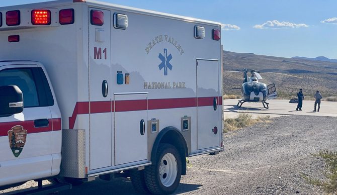 The National Park Service ambulance and Mercy Air’s air ambulance at the landing zone at 3,000 feet just east of Death Valley National Park’s CA-190 east entrance. Photo: NPS