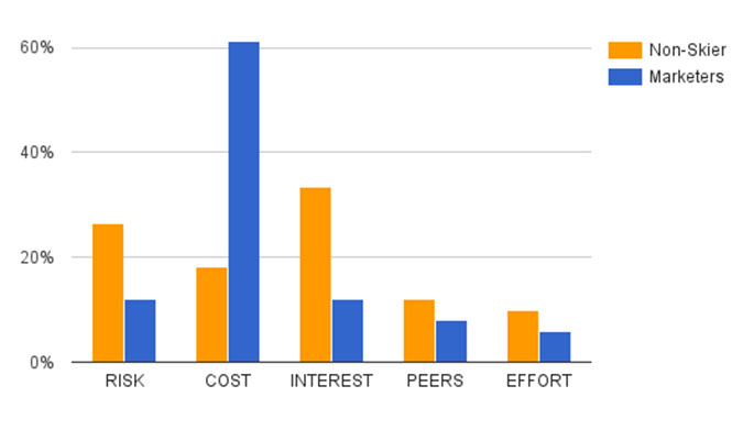 A recent survey conducted by Gregg Blanchard of Slope Fillers asked this very question to a group of 223 non-skiers — or, more accurately, not so attractive. But before sending out the survey, Slope Fillers made their own predictions as marketers to measure how their thoughts would match up with that of the sample.