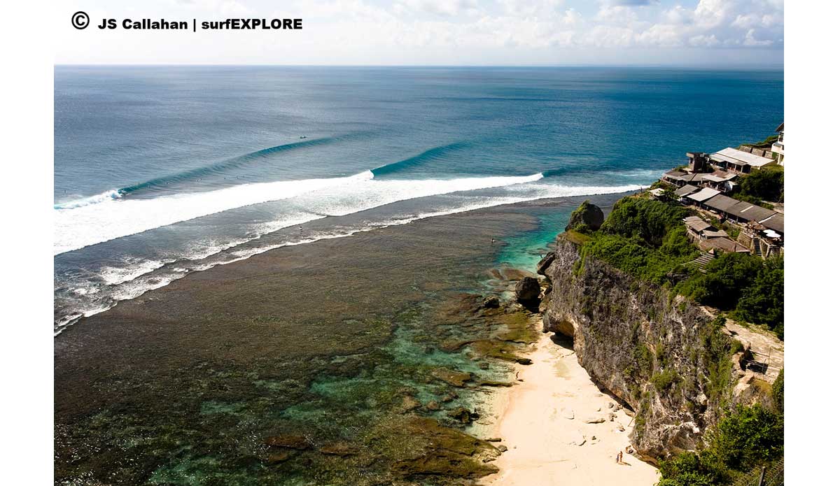 Bali: The Bukit Peninsula is the home of several perfect reef waves, from Uluwatu at the tip of the peninsula to Balangan inside Jimbaran Bay. A helicopter view shows the coral reef formation that makes for perfect waves. Photo: John Seaton Callahan/surfEXPLORE
