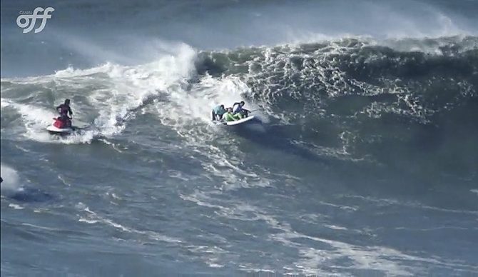 Caught in the slew of videos and highlights that have been coming out of Portugal this entire week, one recent one looks like something out of an episode of Who Is JOB? It’s a clip of Felipe Cesarano, Pato Teixeira, Lucas Chianca, Pedro Calado, Stephan Figeiredo, and Kalani Lattanzi piled onto a supsquatch, hanging on for dear life as they point it down the face of a wave that was estimated as big as 30 feet. Everybody’s safe, they clearly had their fair share of laughs, but man…that’s one crazy squad.