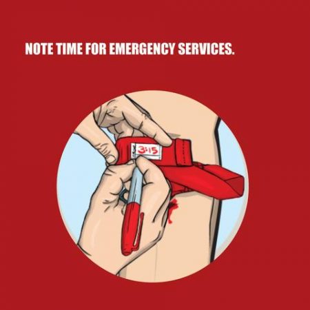 The next step is critical. Making a note of the time of injury and application of the tourniquet lets emergency responders know how long blood flow has been restricted so they can: