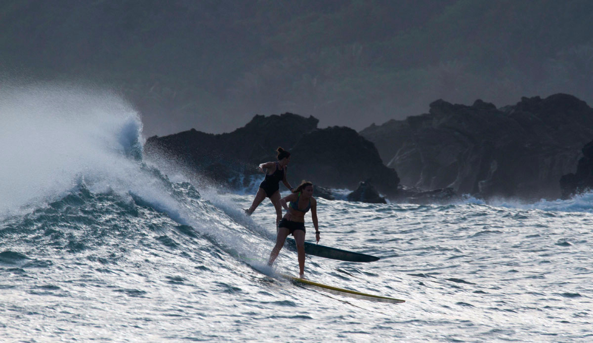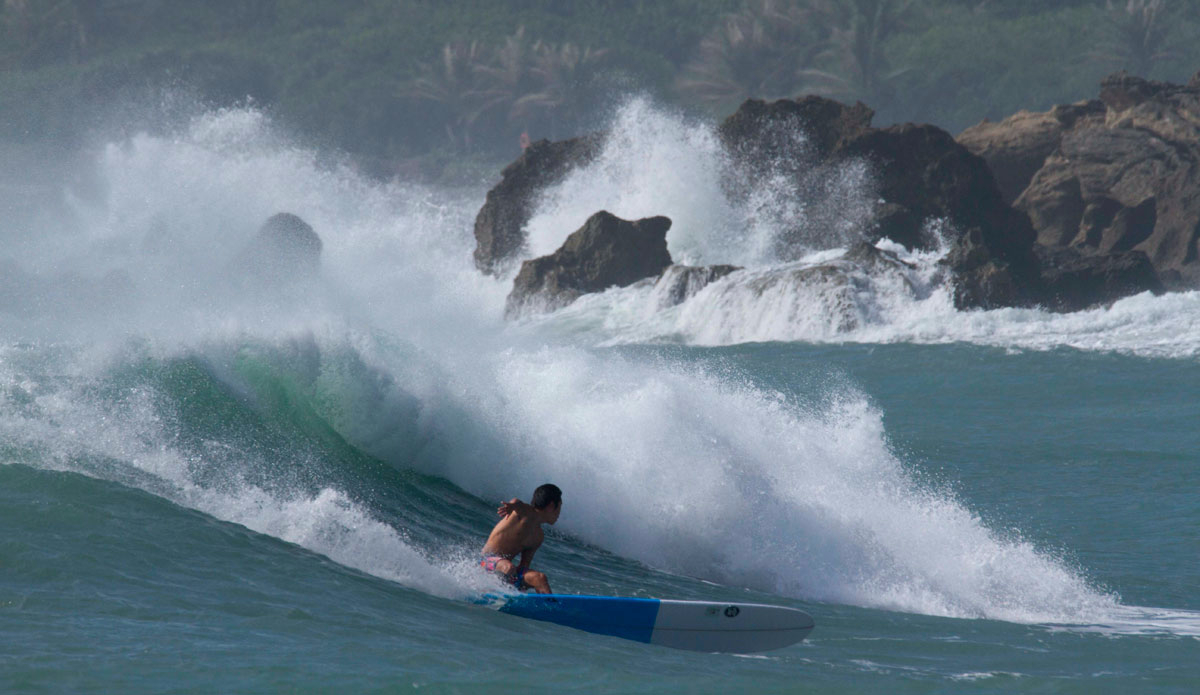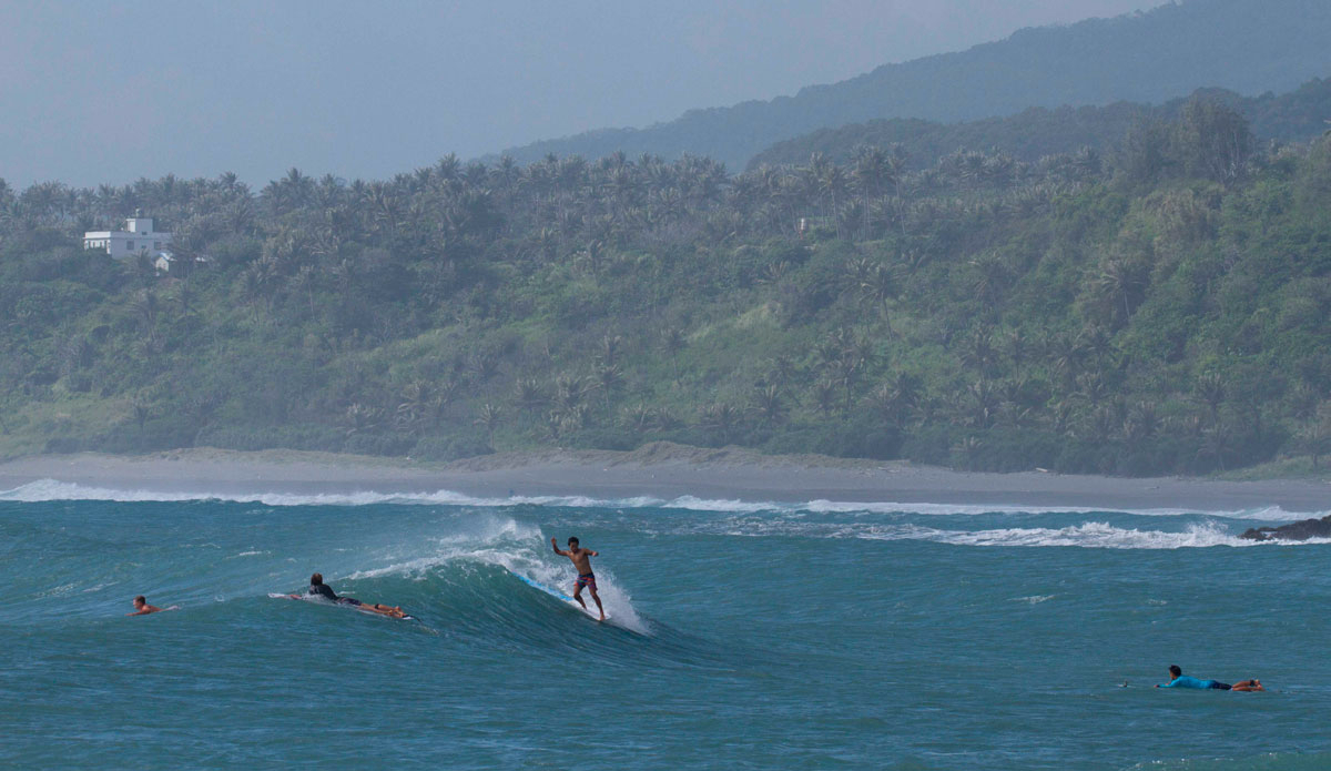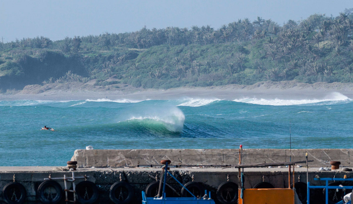 The WSL Taiwan Open of Surfing was cancelled for the day due to strong wind and large surf from an approaching typhoon. On the other side of the wall at Jinzun Harbour, Taitung, though, there is a wave normally ridden by learners–a small, splitting, moderate peak. When there is a typhoon swell and the pro longboarders are in town, however, things change.