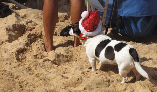 Alex: This is a dog in a hat. He was dragging his head through the sand trying to get it off, but only succeeded in getting lots of sand in his eyes. He looked unhappy and slightly embarrassed about his hat, because he is a dog and doesn’t need one, especially one without a brim. Also, dogs don’t believe in Christmas, so it seems weird to have this much festivity on his head.