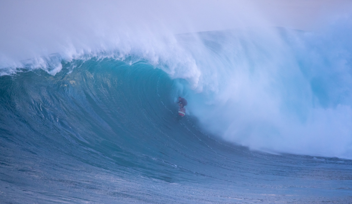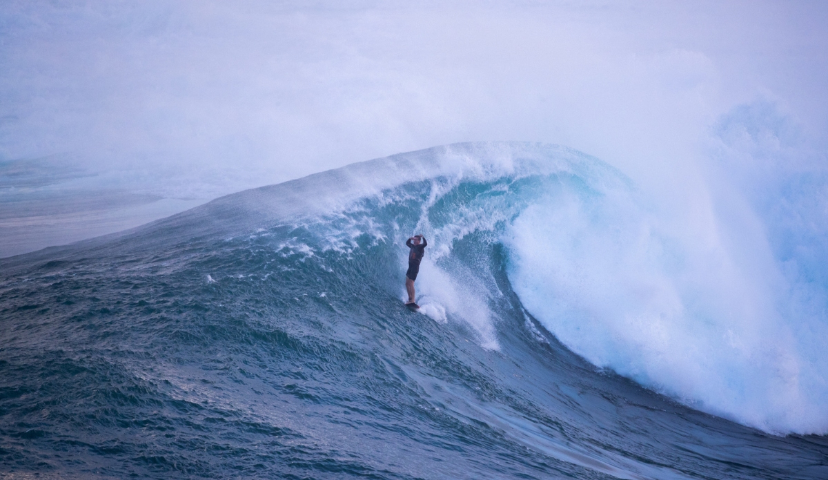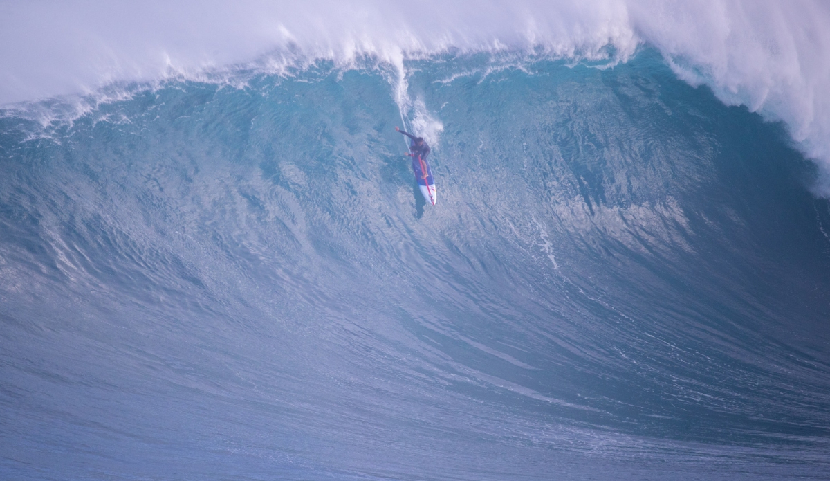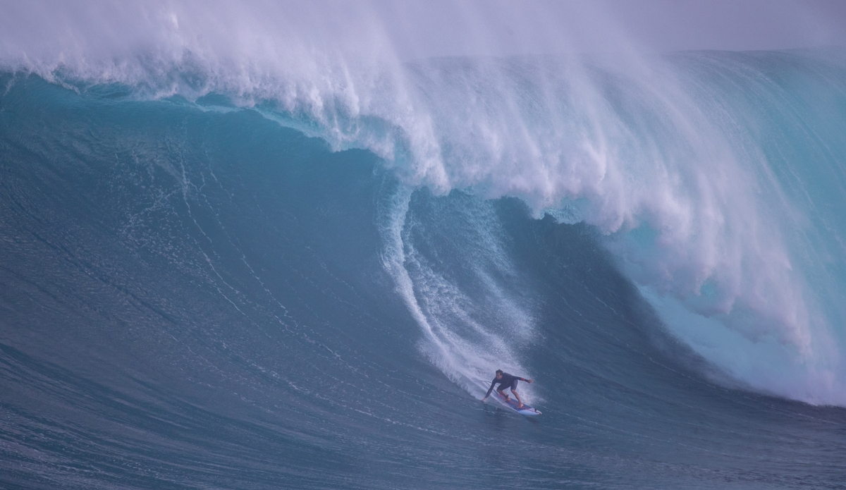 “He adjusts effortlessly and somehow slides out from under the curtain,” photographer Arron Lynton says of Layer’s style. Lynton was tracking the swell, like he does every swell that hits Pe’ahi, and locked in his usual spot on the cliff to document the day. He agreed it was Albee who stole the show Wednesday, “making it look all too easy while casually reminding us all that Albee Layer is the king of the West Bowl.”