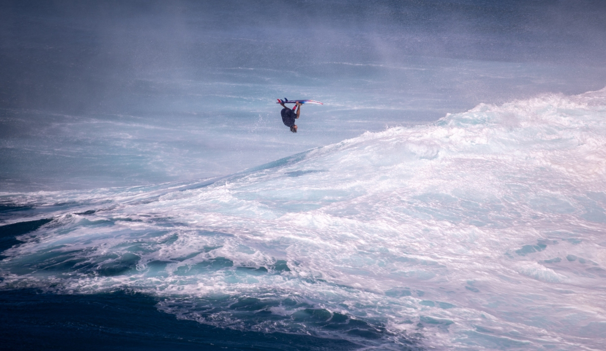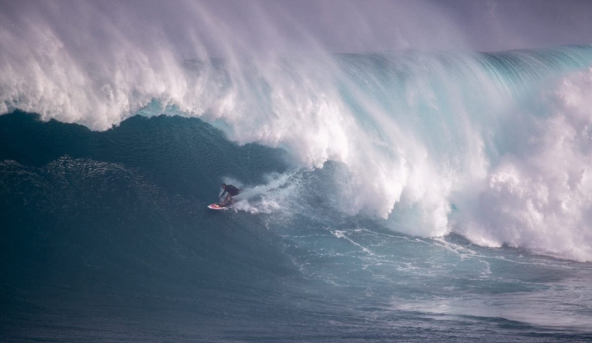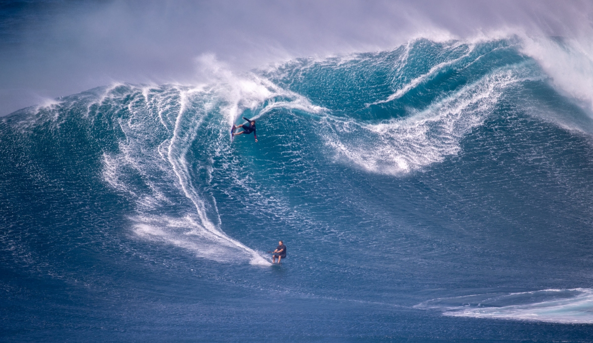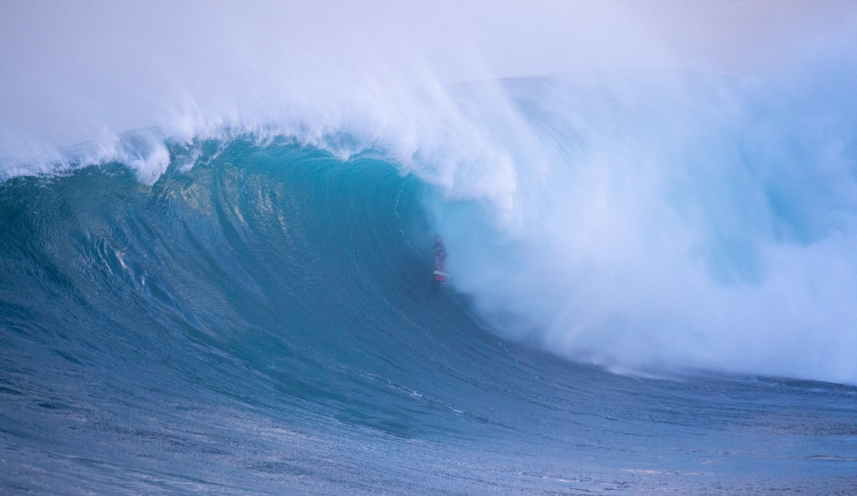 “He adjusts effortlessly and somehow slides out from under the curtain,” photographer Arron Lynton says of Layer’s style. Lynton was tracking the swell, like he does every swell that hits Pe’ahi, and locked in his usual spot on the cliff to document the day. He agreed it was Albee who stole the show Wednesday, “making it look all too easy while casually reminding us all that Albee Layer is the king of the West Bowl.”