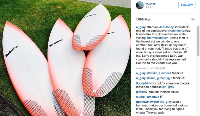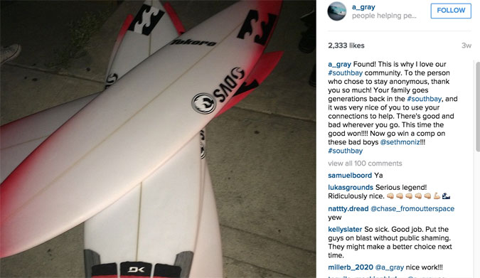 Following the incident, Seth took to Instagram to see if he could somehow get his boards back. Unfortunately, Seth had no luck. That is, until good friend and South Bay resident, Alex Gray, came to the rescue by reaching out to the South Bay community via Instagram.