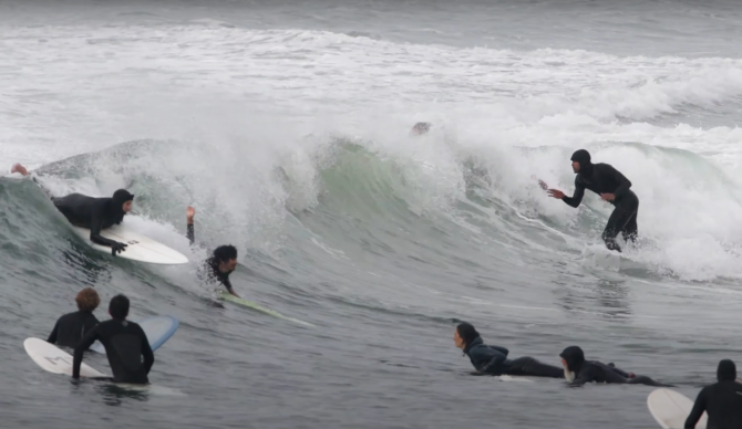 There are a couple of things to take from the video below. One, we all look pretty ridiculous from the perspective of the guy filming from the beach/pier/cliff. And two, a reminder that the chaos of your average day at any wave this busy is unavoidable. Maybe we should cut one another some slack from time to time.