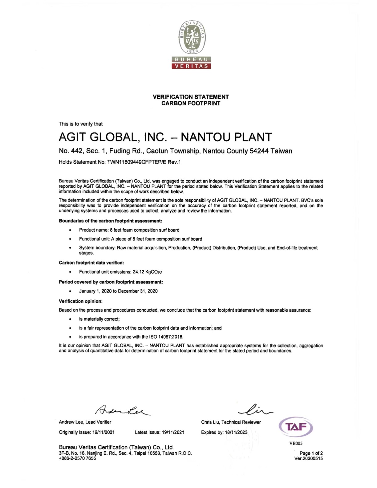 However, one of the biggest takeaways from this study is that mass production, often seen as producing “soulless” boards and squeezing out the “little guy” of traditional surfboard handshapers and manufacturers is doing the environment a pretty big service at the same time. Numbers just released by AGIT Global, the parent company of Wavestorm, and independently verified by inspection and certification company Bureau Veritas (full document linked here and here), show that an eight-foot Wavestorm produced in their Nantou Taiwan plant only produces about 24.12 kilograms of CO2, or 53.18 lbs. That’s less than half as much CO2 as a six-foot shortboard. And we’re talking about an eight-foot board with almost three-times the literage (assuming an average of 30 liters for a six-foot shortboard, an eight-foot Wavestorm has 86 liters of volume). Pretty impressive.