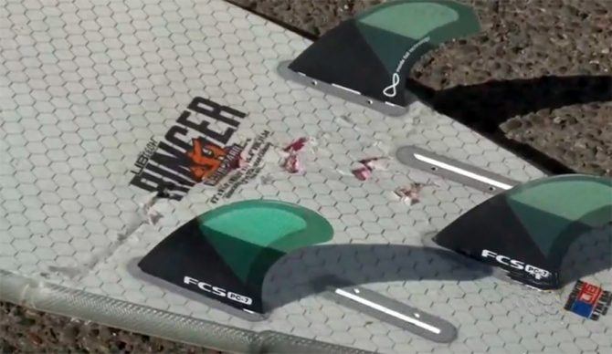 Bite marks left after the recent shark attack at Salmon Creek (Calif.). The victim survived, with the help of other surfers who brought him to shore and applied an improvised surf leash tourniquet. Photo: YouTube Screenshot