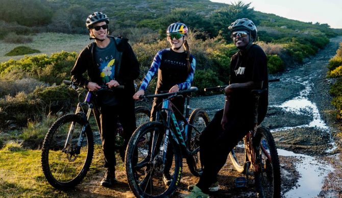 Jeremy Searle and Luis Medearis pose for a shot with World Champion Mountain Biker, Kate Courtney, after a grueling climb in Marin County, CA. Photo: The Inertia