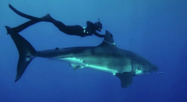 So here’s something you don’t see everyday: a beautiful girl clamped onto the dorsal fin of a Great White Shark. If you do see this everyday, then you’re living a great life.