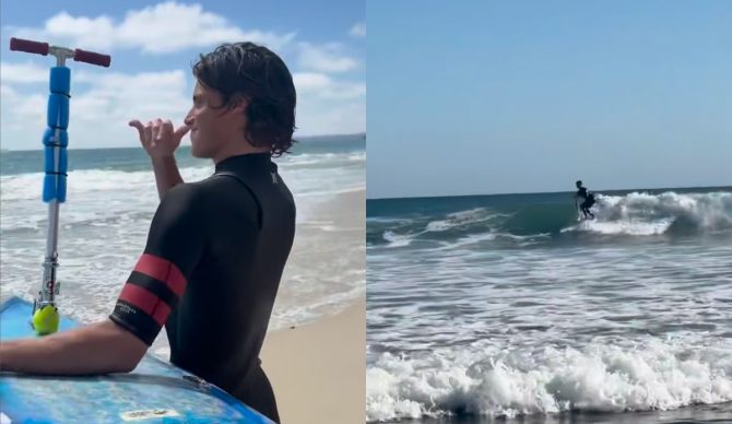 The contraption can be seen in an Instagram video posted by the account i.love.chicken.joe. It appears the madmen featured in the edit have literally bolted a set of severed scooter handlebars onto the deck of a shortboard. They also thoughtfully wrapped it in pool noodles and a tennis ball for the sake of safety and a little bit of extra buoyancy.