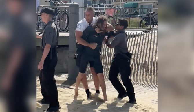 The video begins with a handcuffed man in a wetsuit being led away from the beach by police officers. As the police continue to pull him, the man says that he has a beach pass and a woman attempts to show them the pass. Later on, as onlookers confront the officers, the man can be heard in the background telling the officer holding him, “you are not allowed to do this.” From there, a struggle begins that ends in the officers putting the man in a chokehold and pinning him to the ground. The man is then placed in handcuffs and led away.