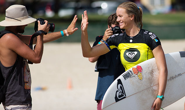 Bianca Buitendag high-fives a photographer at Snapper Rocks. Photo: Matt Dunbar