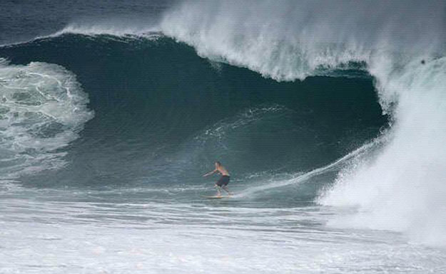 The closer Daz paddled to the breakers, the weirder things got. The mountainous sets became more visible, avalanching all the way to the beach, jet skis buzzed about surveying the scene, and the selective group of surfers scraped up the steep faces and over the bushy lips like matadors dodging the horns of a fuming bull. Daz realized he was out of his league when he saw Shane Dorian, and out of respect and fear of embarrassment in front of his idol, he began paddling away. Before Daz could exhale to gather his thoughts, he heard Dorian yelp at him, pointing outside to the biggest set wave he ever laid eyes on. Adrenalin started pumping, his heart was racing and his arms were motoring like all hell.