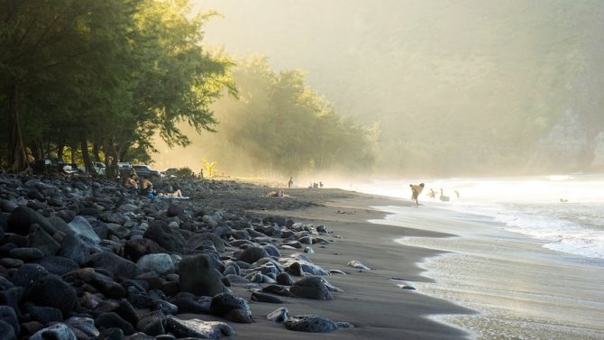 Surfers exit the water on the black sand beach of Waipi’o Valley. Photo: Michael Olsen//Unsplash.