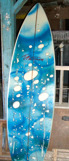 Enter the bubble board renaissance. I bought the bubble board, a 6’ 1” T. Patterson, back in 2008 in preparation for my only trip to Indo. In anticipation of the aqua clear water, I had a friend paint the bottom of the board. I had him paint it to resemble bubbles about to break the surface of water. It was groovy, it was trippy, and it looked great in Indo in that beautiful water. Upon my return from the trip, I opened my board bag only to find that the whole nose had been nicked off. I guess these things happen. I relegated the board to a corner of my apartment where dinged boards go to collect cat hair.
