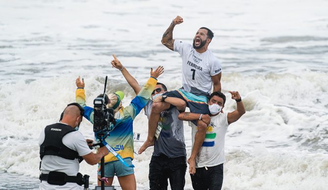 Ferreira was entertaining throughout but saved his best show for the final, where he pinned Kanoa Igarashi in combo early and never relented, putting the squeeze on the Japanese surfer with more rail turns than he employed the entire event, leaving Kanoa kicking his board and waving his arms in frustration. Italo began the celebration in earnest with a minute left in the final heat, embracing his Brazilian teammates and literally weeping with joy. His tactics changed mid-heat after he broke his board hitting a monstrous closeout section.