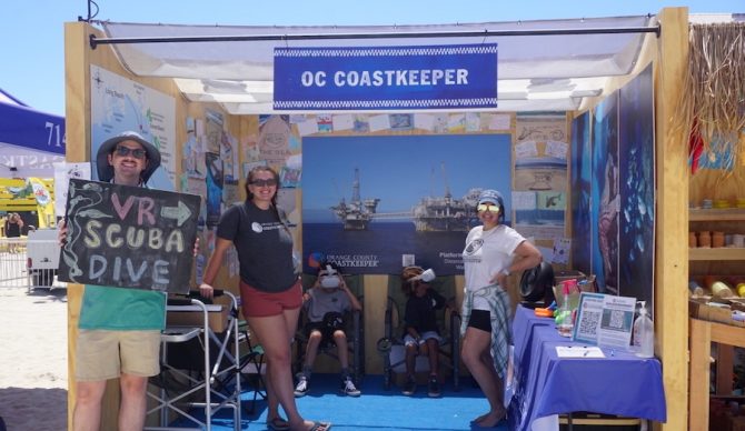 Orange County Coastkeeper also took the experiential route for its booth. At first glance, OCCK almost seems like a tech company rather than an organization working to keep the waters of Orange County swimmable, drinkable, and fishable for years to come. In the picture below, visitors to the booth sit in camp chairs hooked up to VR goggles. They’re taking a virtual dive to check out the ecosystems thriving on the “artificial reefs” formed by the pilings below drilling platforms off the coast of Huntington Beach.