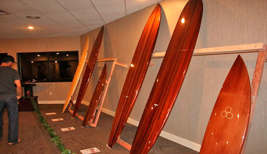 Recently, Larry and a number of other shapers and surfers, including Kelly Slater, Jeff Clark, Carl Ekstrom, Jim Phillips, John Cherry, Reynolds “Renny” Yater, and Al Merrick, participated in an exhibit on the North Shore called Surfers and Shapers (also the name of his film). The exhibit focused on Larry’s journey to bring together the world’s best surfers and board shapers to build the ultimate wooden surfboards from the rarest woods on Earth.