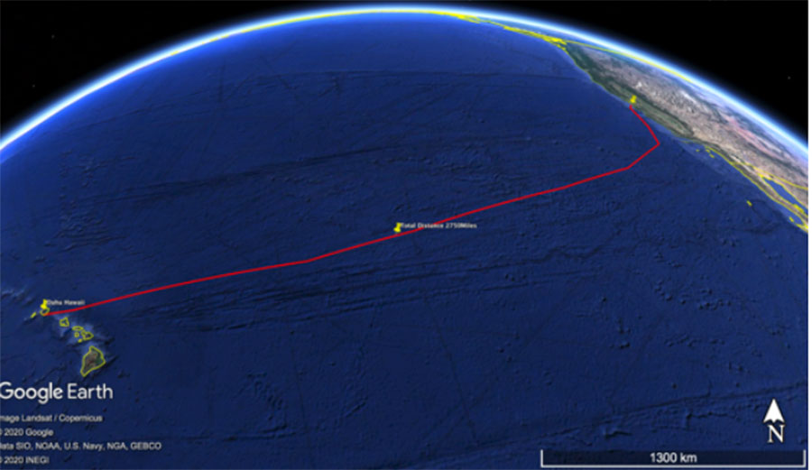 The journey is long, especially if you’re doing it alone on a board with a wing for propulsion. Image: Google Earth/ChrisBertish.com