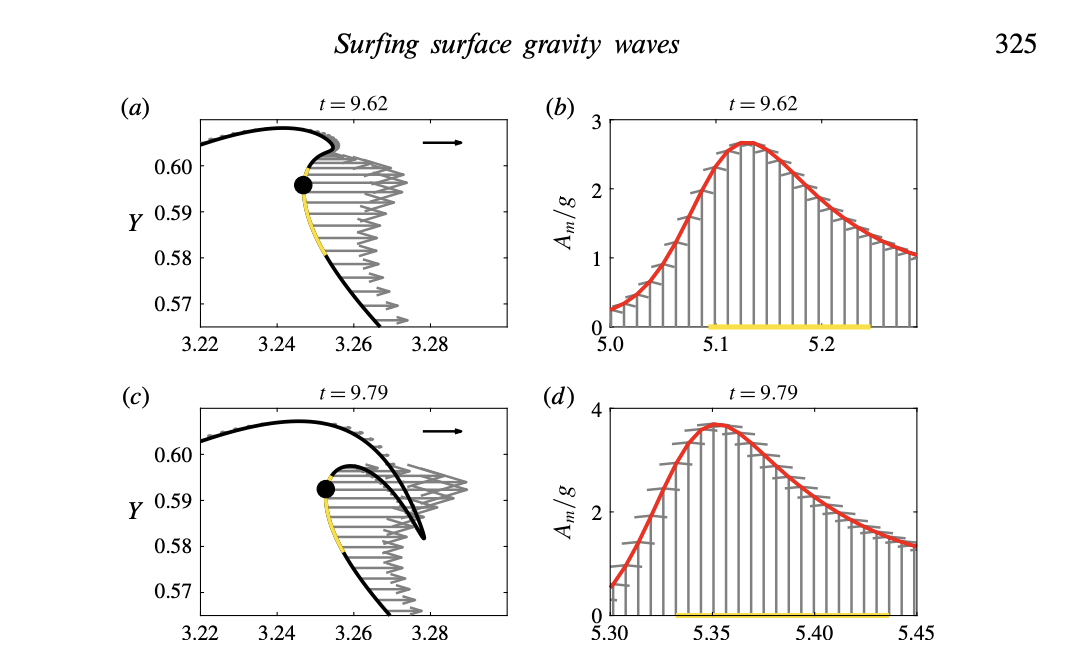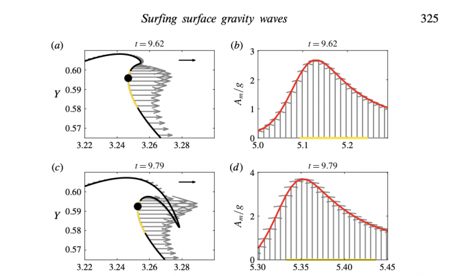 “A highline in the upper region of a breaking wave just below the crest provides more opportunity for acceleration when compared to, say, a bottom turn, where you go out of that sweet spot region,” he explains. “What’s super cool to me about this paper is that water molecules just below the crest of the simulated waves start out with an acceleration of less than half a G, and that dramatically increases to an acceleration about four times the force of gravity, which infers that a surfer can experience extreme increase in acceleration if a highline is initiated just after takeoff and extended out through the ride.