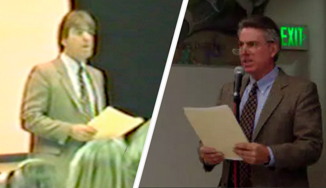 Lance, then (1984) and now (2004), reading the same speech, in the same jacket.