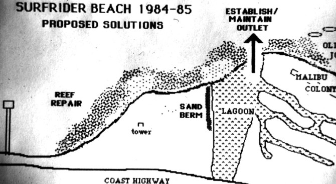 Being a high school teacher, I knew how to write a lesson plan, and the Parks guys needed some schooling about surfing. I opened with some lineup shots of the place that got the crowd hooting. Then came slides that Lance had taken from a variety of angles, before and after the Parks bulldozer had done its dirty work. Finally, I presented four slides of graphics I had done on the Mac, with Tom’s help, culminating in a slide that showed exactly what we wanted.