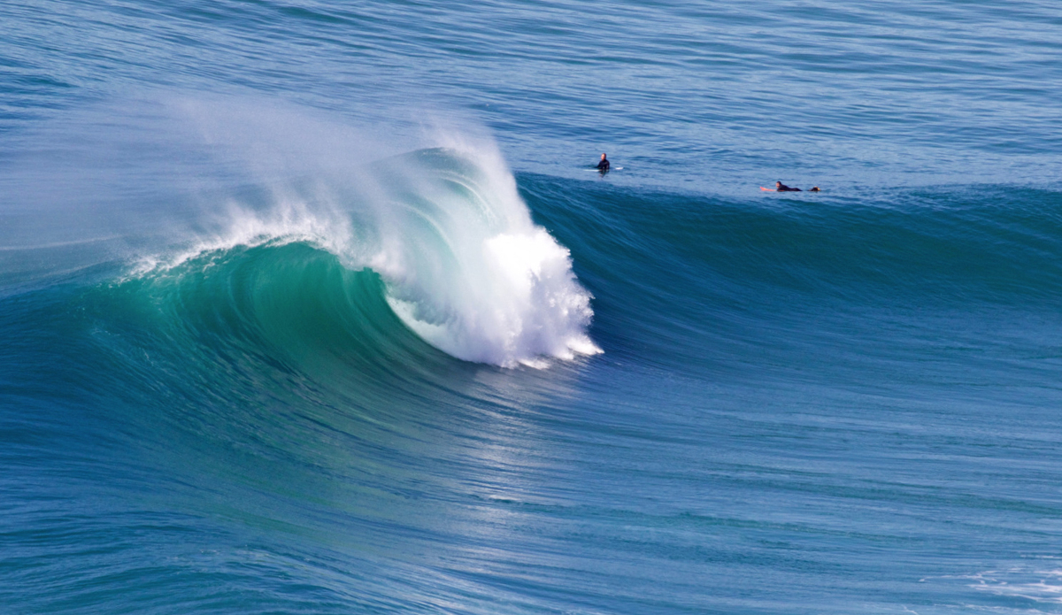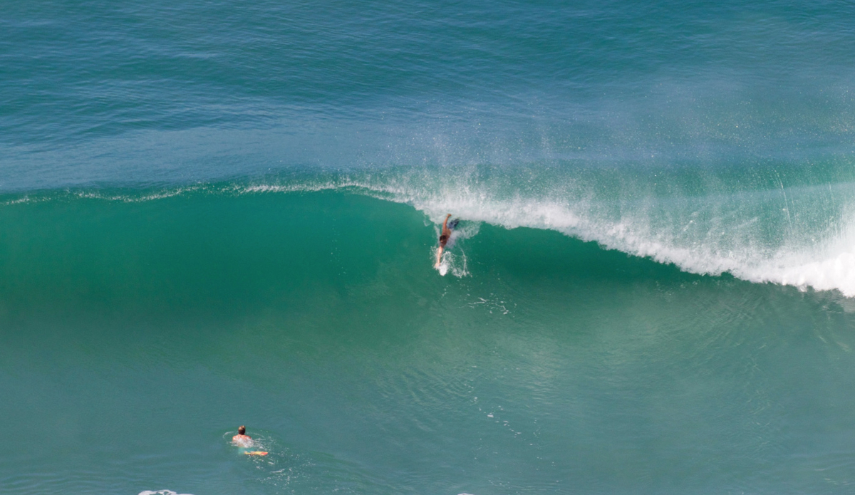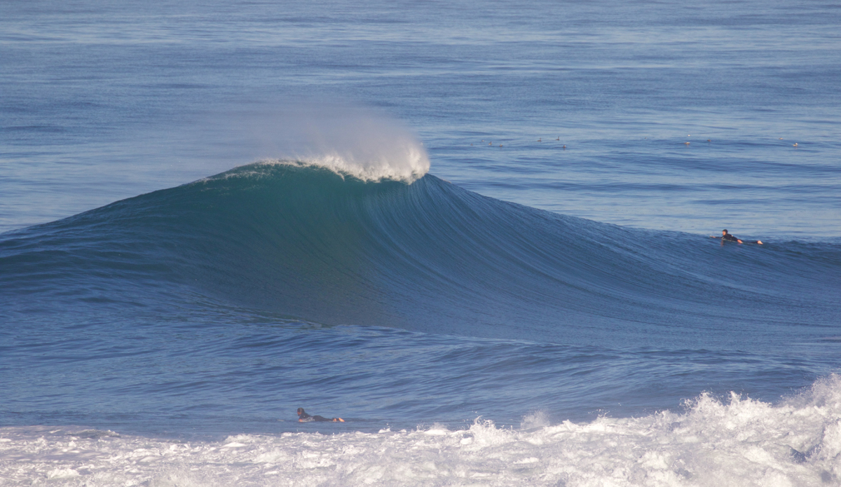 The surf was huge and perfect. With local San Diego buoys reading eight feet at 18 seconds, the swell came directly from the west. Double overhead+ peaks moved at a velocity rarely experienced. Windless, glassy conditions persisted throughout the morning. Two months of extraordinarily solid surf removed most sand from the beach and left behind piles of rock. With high tide smashing head-high whitewater off the cliff, entry and exit are hectic. After catching several dreamy waves, I went to the top of the cliff to photograph the epic surf from my favorite vantage point. Peaks continuously bent and warped out of the Canyon, thundering in the neon blue-green water. Two bodysurfers began riding waves, sans wetsuits in the 80°F, 11 a.m. sun. Trading barrels, they lasted about 45 minutes. Then, a few locals showed up.
