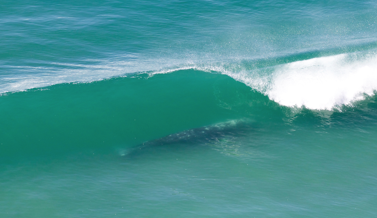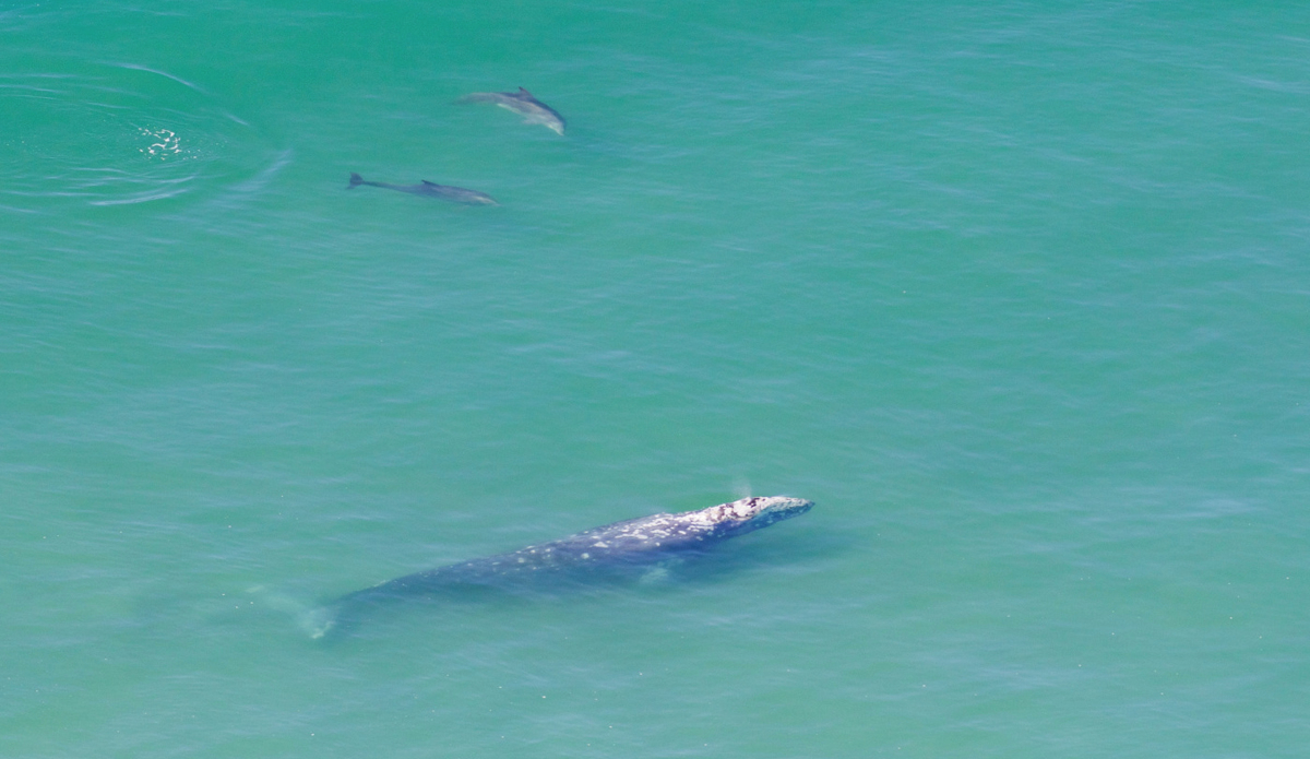 This particular specimen was a male who was getting an early start on the long swim north to Alaska. He continued his cruise along the shoreline, dolphins buzzing around. I must admit, though, I was concerned. I’ve spotted plenty of whales and some of them just beyond the breakers. But this whale was now 40 feet from shore in roughly 5 feet of water. An unusual and uncomfortable place for a 4- foot, 30-ton marine mammal. I was prepared to call SeaWorld Animal Rescue and help them push the creature back into the sea.