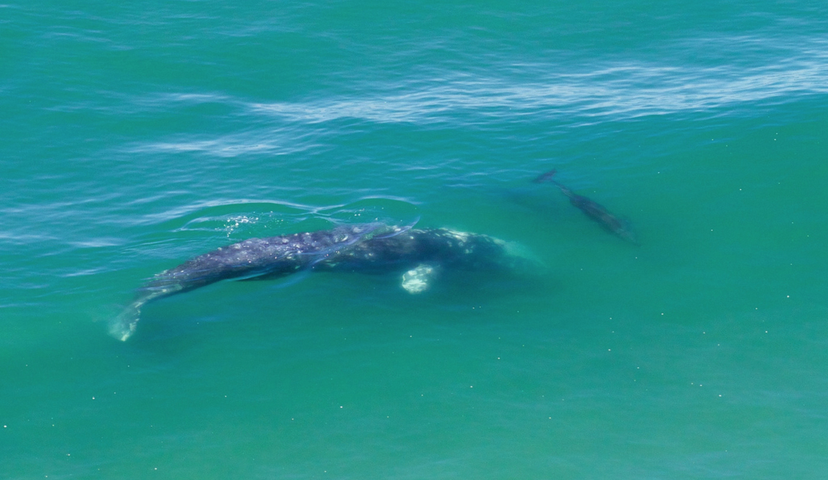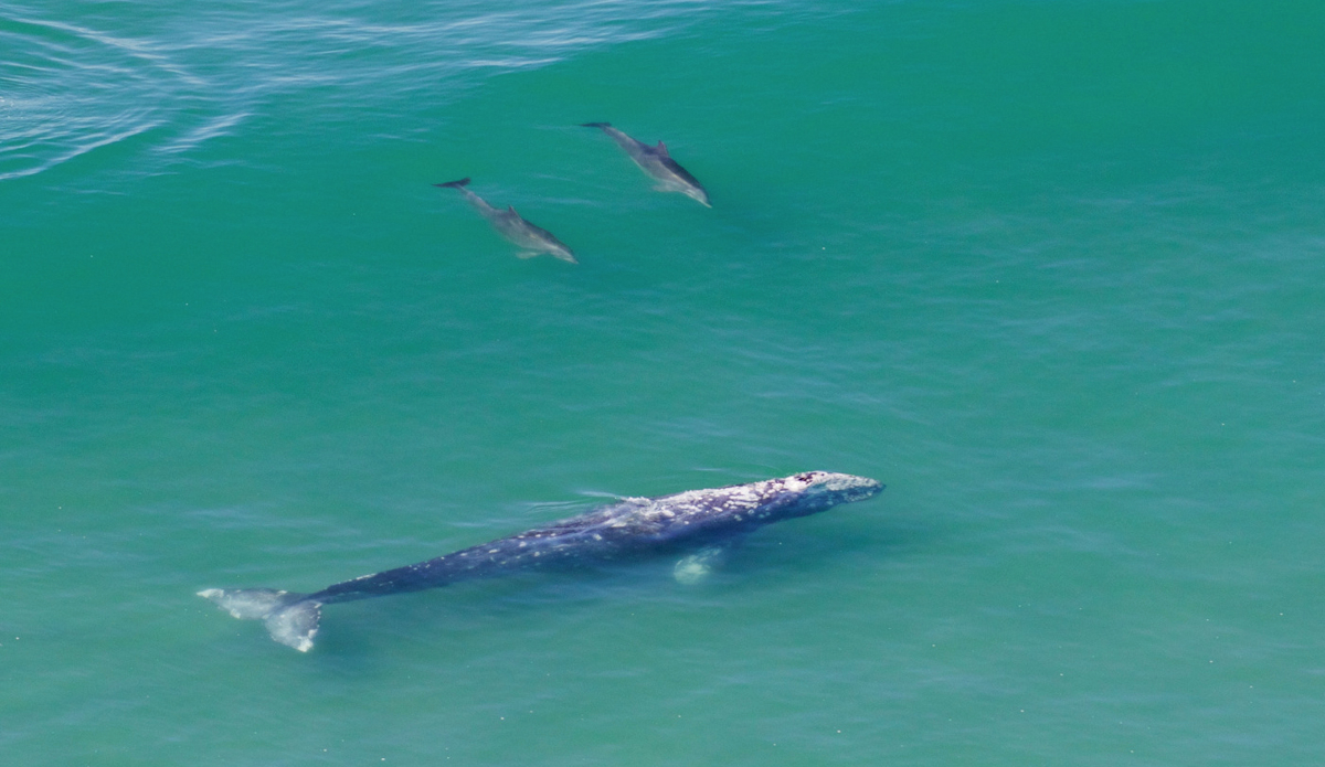 Gray whales migrate annually from summer feeding grounds east of Alaska to winter nursing grounds along the Baja Peninsula. Spouts and flukes are frequently witnessed along the Southern California coast, but much less common so close to shore. The 13,000-mile round trip migration is believed to be the longest of any mammal.
