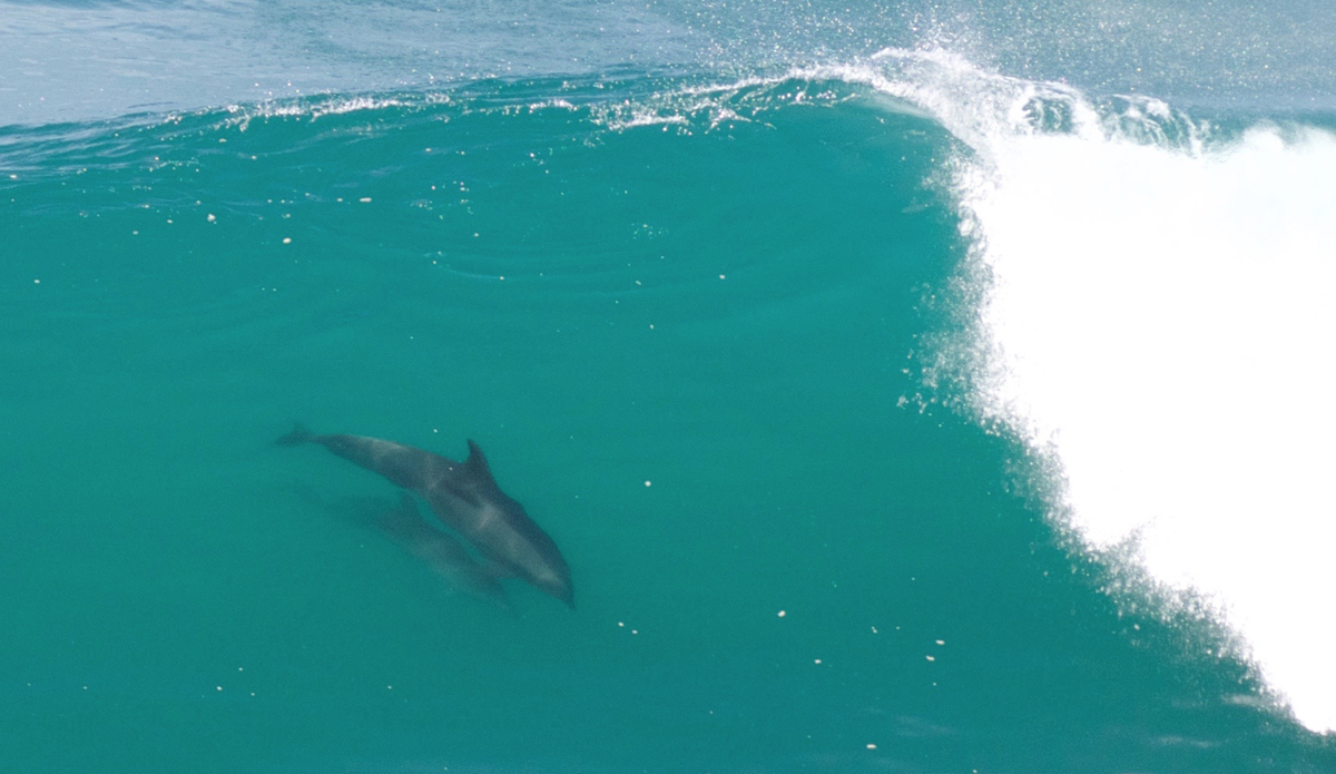 A pod of eight dolphins suddenly appeared from the south. They rode waves together and kicked out the back. Shortly after, I spotted a larger dark spot in the water. I first thought it was the dolphins in a tight bunch, but as it came closer, I realized it was a gray whale cruising abnormally close to shore. The dolphins swam circles around the large cetacean, almost as if they were graciously escorting him back to whale territory.