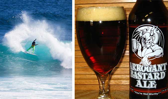 Stone Brewing’s Arrogant Bastard Ale touts itself as an “aggressive ale” that most people lack the taste or sophistication to appreciate. To say the least, it’s not for the faint of heart, and neither is Michel Bourez’s surfing. Like he demonstrates at each and every contest — he’s not just out to ride waves, he’s out to rip them to smithereens one power hack and gouge at a time. Each of Michel’s turns is like a roundhouse kick to the teeth, and every sip of Arrogant Bastard is an uppercut to the jaw. A match made in heaven.