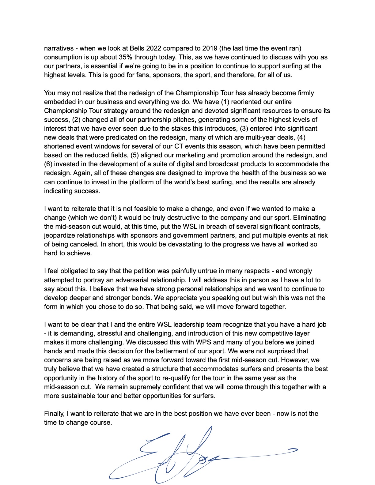 Furthermore, Logan says, the WPS, a union per-se for CT surfers, has “co-developed and agreed to every change and enhancement we have made to the Championship Tour format.” He goes on to state why the mid-season cut is actually a good thing. “Our events are too long, often having to run in conditions that are not ideal, and with the mid-season events lacking any real stakes.”