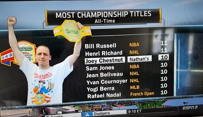 Included on ESPN’s list of individuals in sport with the most championships are athletes from such diverse disciplines as basketball, baseball, hockey, tennis, and… hot dog eating.