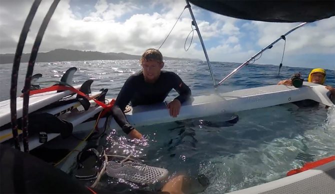 “Excited to surf and foil, we head out on the dingy to find some waves,” Nate said. “While I foiled, John, Ivan and Erik followed in the dingy. About two miles from the boat, downwind and near a sketchy reef, John capsized the dingy due to everyone falling to one side in the trough of a wave.”