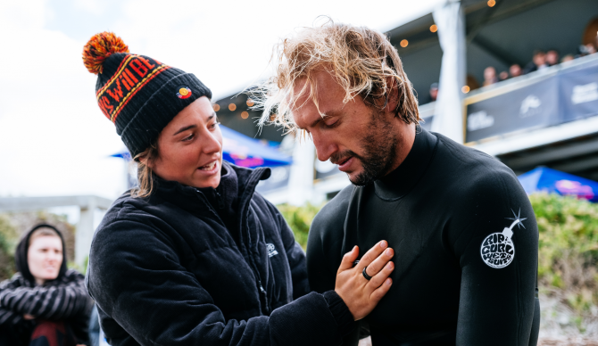 Tyler Wright encourages Owen Wright, who was left on the cut line bubble after an emotional Round of 32 at Margaret River in 2022. Photo by Aaron Hughes//World Surf League