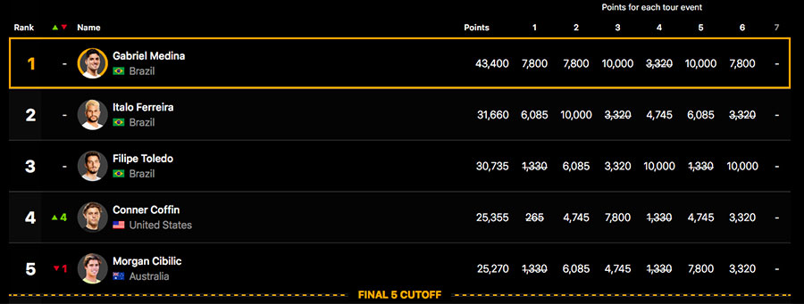 Something has changed in Gabriel Medina’s eyes. The fire is still there, but the intensity has changed. Not any less hot, but it’s less… fiery. It’s a deep coal, smoldering away, burned down after years of a blazing wildfire. He’s calmer, more relaxed, and having more fun, and it’s working for him. Coming into the World Surf League finals at Trestles, Gabriel Medina is sitting on a very substantial ratings lead: 11,740 points more than Italo Ferreira, who is in second place. For comparison, Filipe Toledo, who sits in third in the rankings, is just a little over 1,000 points behind Ferreira. That lead puts Medina as almost a sure-thing to win a third World Title at Trestles, at least in my mind. The only thing that might throw a wrench in his plans is the new format.