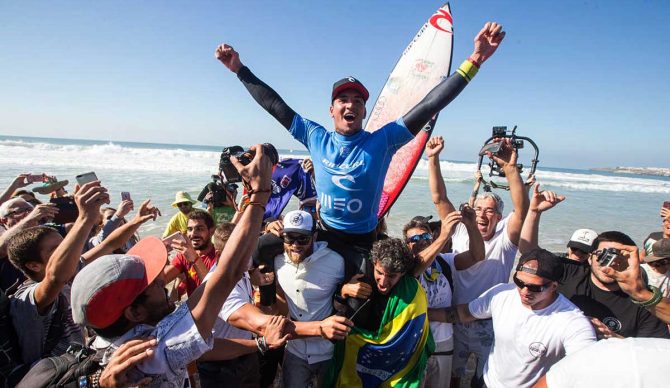 Gabriel Medina and Julian Wilson just battled it out in the final of the MEO Rip Curl Cup Pro Portugal, giving Medina his second straight win and a perfect run through Europe this year. It’s a hot streak that’s brought him all the way into the number two spot on the Jeep Leaderboard with just one event to go and a fairly slow first half of the year. The runner-up finish for Wilson pushed him into the top-5 of the rankings after a win in Tahiti and a semis appearance at J-Bay have made this a hot second half for the Australian as well.