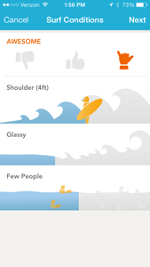 The first rating is a general feeling about how the waves look or how they were. Apply a thumbs down, thumbs up or blast a shaka if you’re still grinning from that last wave. The second rating lets you claim the wave/swell size using a sliding scale (i.e. flat, overhead).