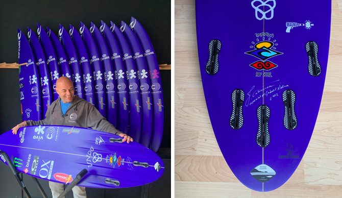 Gabriel chose the new blue color way to match the Tahitian waters, and the only change from previous years is some new five-fin configurations in case Medina wants to switch up to a quad-fin set-up. The wildcard in the much-stickered pack is the six-channel design, which Cabianca said Gabriel will most likely try in some freesurfing sessions, rather than in the white heat of competition. However, if the extra speed is to his liking, the design could find its way into the Olympic selection.