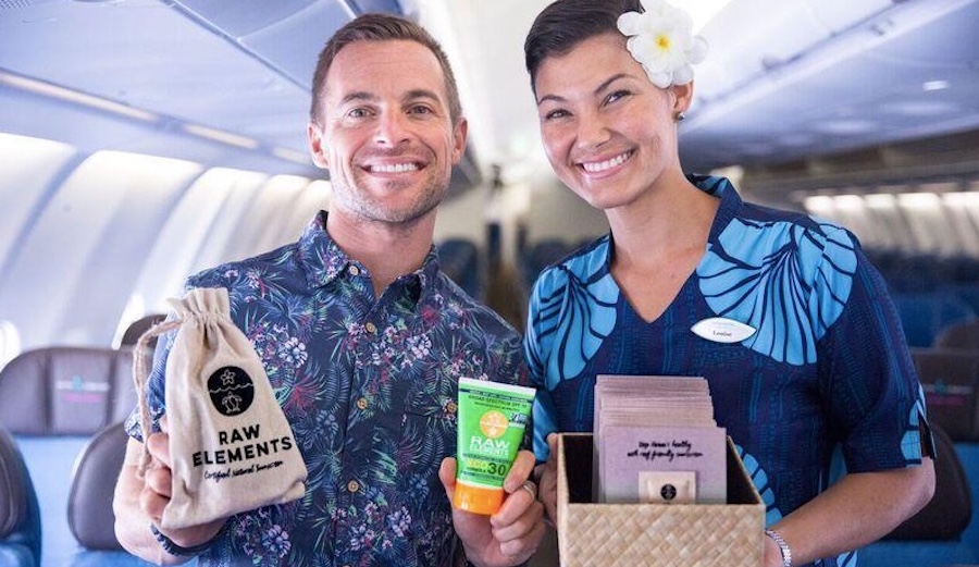 Hawaiian Airlines has teamed up with reef-safe sunscreen company RAW ELEMENTS USA to educate travelers about the risks of commercial sunscreens containing chemicals harmful to coral reefs. Photo: Hawaiian Airlines