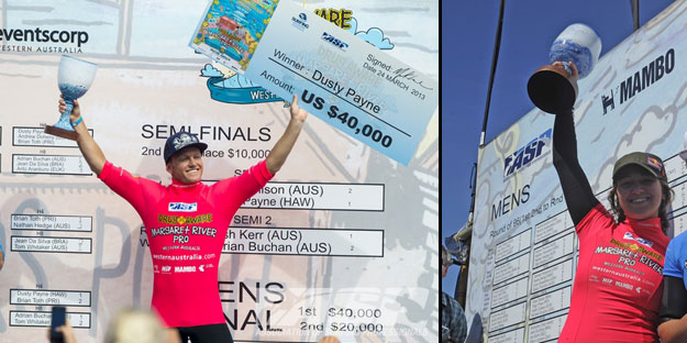 The final day of the waiting period for the 2013 Drug Aware Margaret River Pro ran in six to eight foot inconsistent but powerful south west swell at Surfers Point in Margaret River, Australia. The powerful Haleiwa-like waves at Surfers Point proved to be especially to the liking of Hawaiians Carissa Moore and Dusty Payne, both of whom were crowned as this year’s event champions. Super Sunday ran 10 heats total, and saw everything from low scoring heat affairs, to one sided heat victories, to shootout high performance and high scoring nail biters.