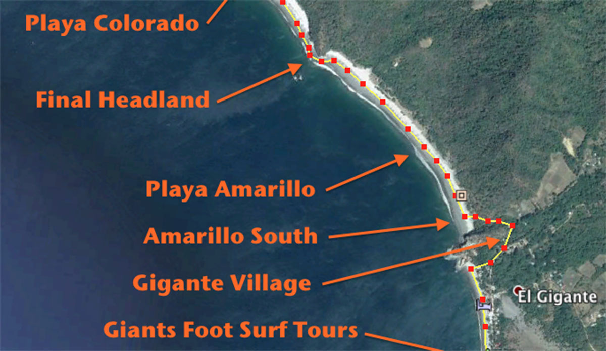 Amarillo is the polar opposite of Gigante. With only one residence at the very South of the beach, Playa Amarillo is almost completely void of human disturbance. At the very south of this beach, there is a slightly shadowed break called Amarillo South that hosts a few sand bottom peaks and a flat rock reef. The reef will bowl up and occasionally offer a heavy barrel, left and right, given the right conditions. At low tide the rock formation is completely exposed. This break is just short of the halfway point in the hike to Colorados. Playa Amarillo extends for a little over a kilometer and during this stretch of the walk you can count on being alone. Random sandbars here will get epic with proper conditions, but the section is closed out most of the time.