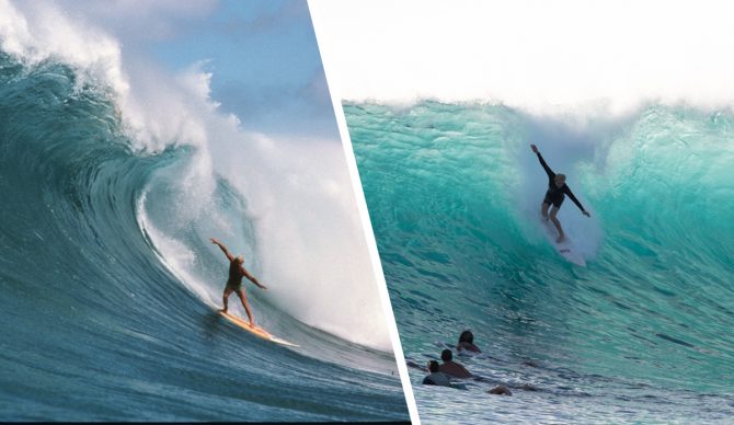 Like father, like son. Richard Schmidt, who placed third at the 1990 Eddie, and his son, Richie, share a few stylistic sensibilities in heavy surf, no? Photos: (L) Aaron Chang courtesy (R) Both Courtesy of Schmidt Family